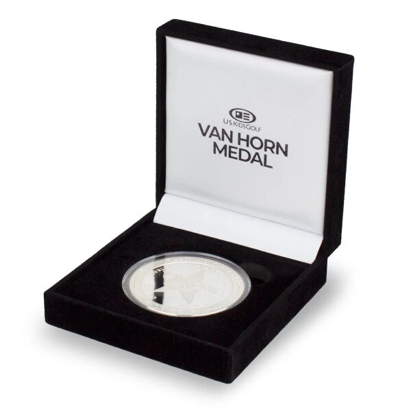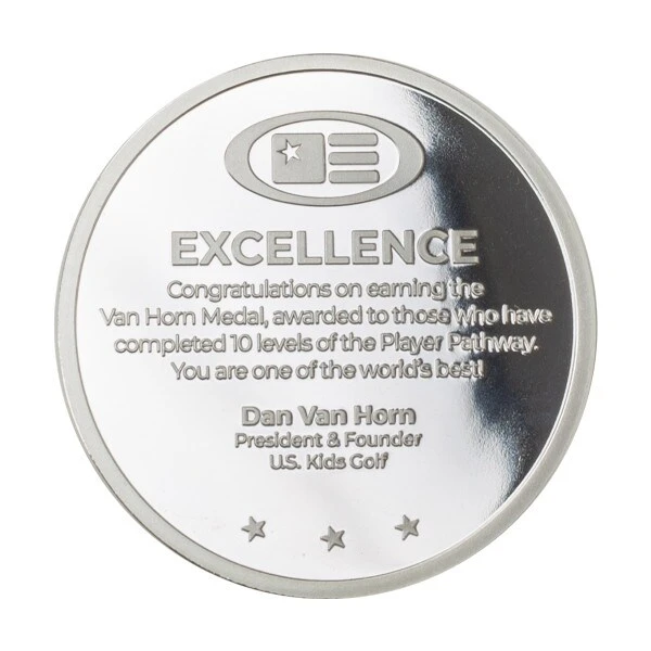 Recognize your golfer as they achieve the significant milestone in the excellence of passing Level 10 of the Player Pathway. The Van Horn Medal is a special Platinum Player Coin provided to players as they complete ALL ten levels of the program. This 2″ platinum coin is encased in acrylic and packaged in a black velvet keepsake box.